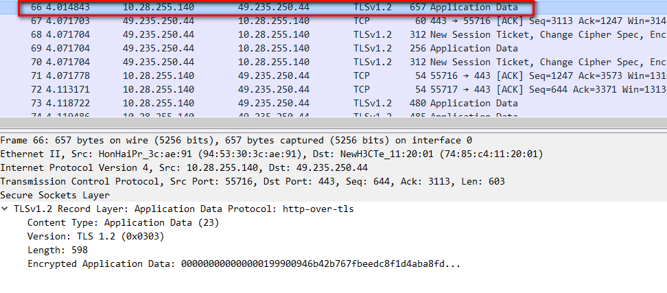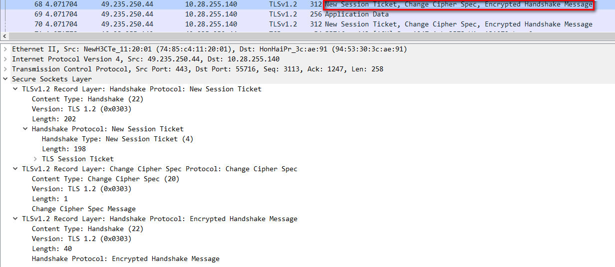 - 双方以加密方式互相通信应用数据。需要新的 session 时,由 server 端发起 change cipher spec 请求。