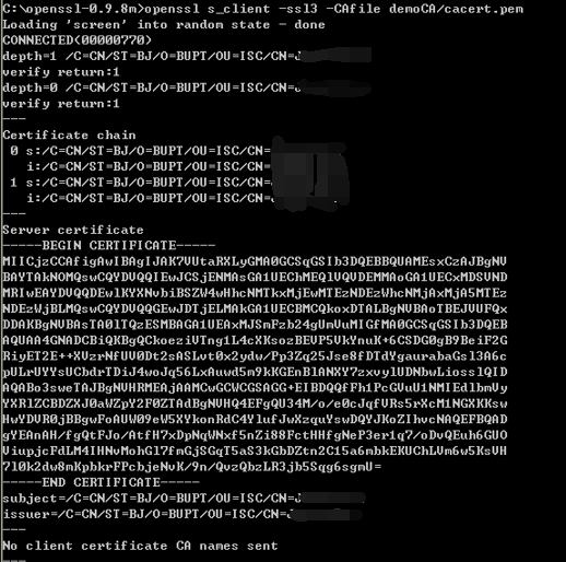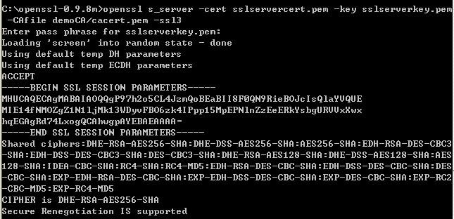 openssl s_server -cert sslservercert.pem -key sslserverkey.pem -CAfile demoCA/cacert.pem -ssl3 openssl s_client -ssl3 -CAfile demoCA/cacert.pem