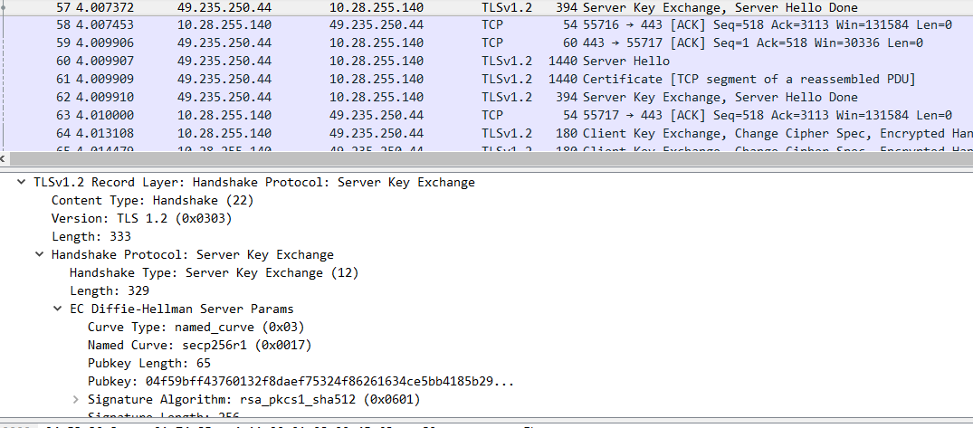 - 服务器端发回 server hello,这个 server hello 包含认证信息和服务端的密钥交换。这次交换用到了椭圆曲线 DH 协议。