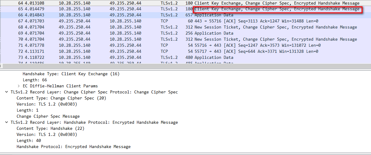 - 客户端的密钥交换。握手消息此时已经处于加密状态。