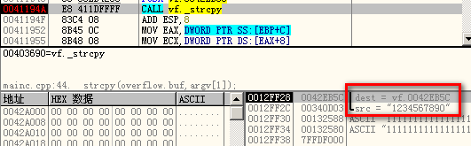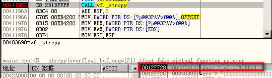 第二个strcpy时,将第二个参数拷贝到overflow1.buf中,其首地址为0x42eb14,在overflow上方,我们想到应该可以利用这个关系,溢出这个 64 字节的buf,覆盖掉vtable,让其调用 shellcode