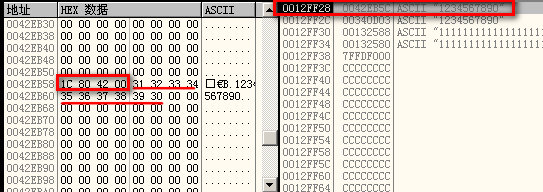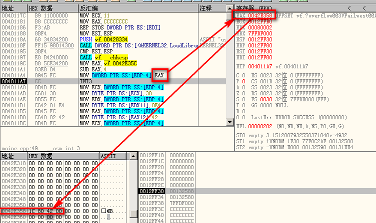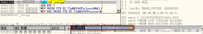 从这两张图可以看出,缓冲区的入口为0x0042e35c。虚表指针位于缓冲区前,p_vtable定位到了这个指针,它指向了0x0042e358处,进一步证明缓冲区入口正确。