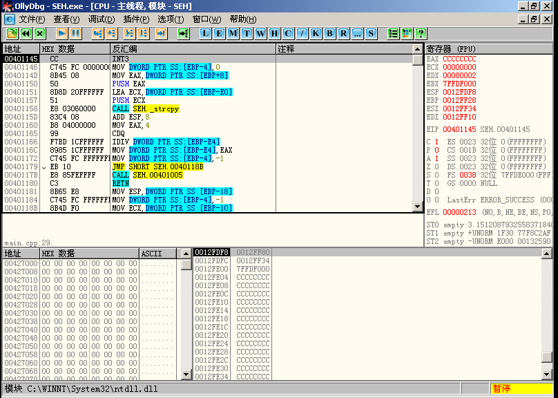 - 启动程序,在运行到 int 3 断点时成功进入 ollydbg 中。