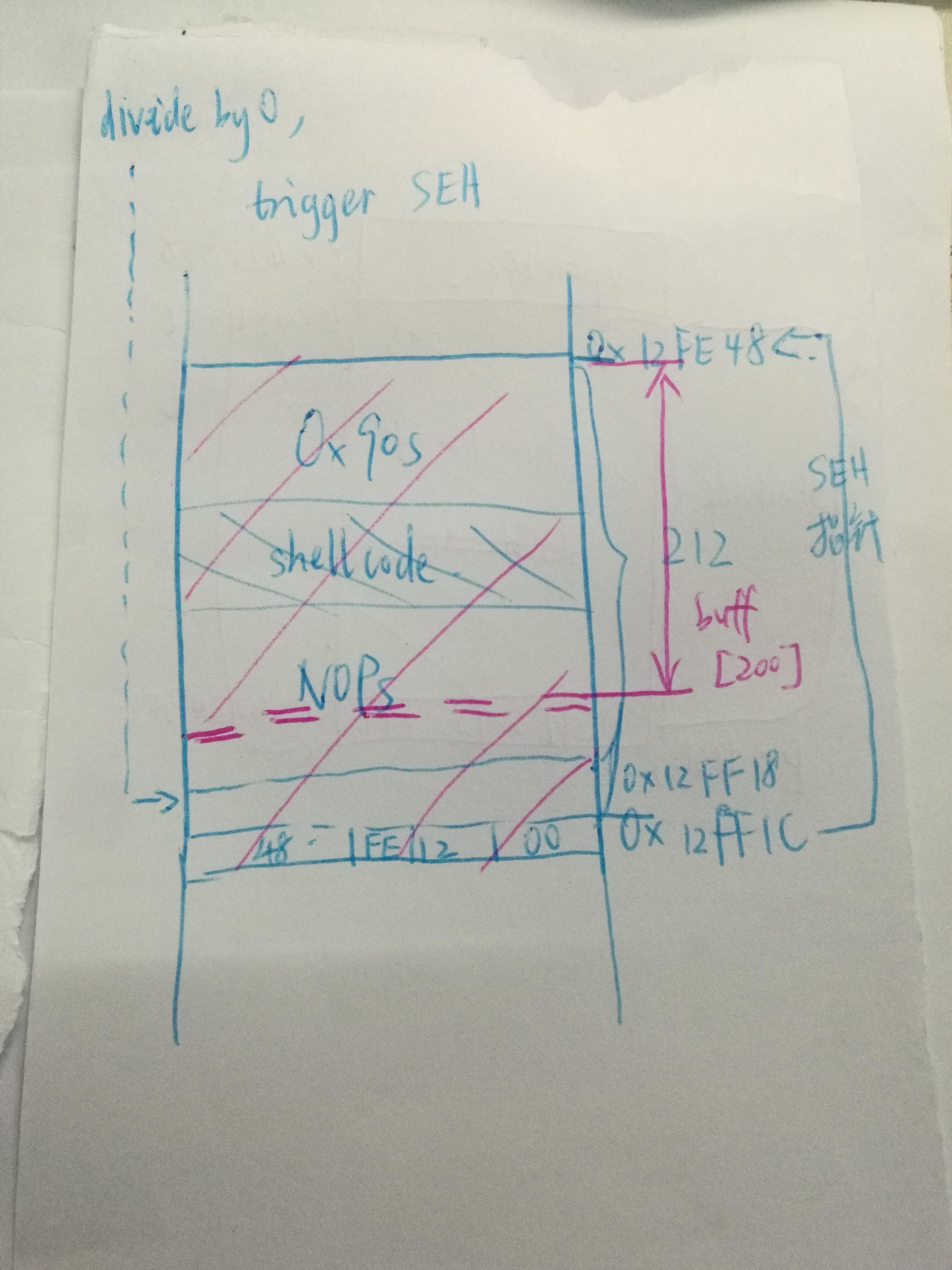 0x12ff18,异常处理地址是0x12ff1c,我们的 shellcode 应该填充这些差值空间,总共有 212 个字节(0x12ff1c-0x12ff18)回头看一眼我们要填入的 shellcode,最后四字节 (\x48\xFE\x12\x00) 恰好是 shellcode 的起始地址!